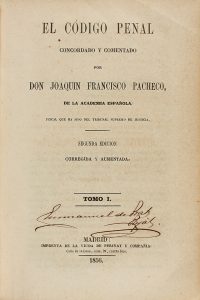 1856. PACHECO, J.F.: EL CODIGO PENAL CONCORDADO Y COMENTADO. Madrid: Imprenta de la Viuda de Perinat y compañia, 1856. 3 vol. en 8º mayor. I: 534 p., 1 h.; II: 535 p.; III: 495 p. Encuadernación en holandesa media piel y cartoné editorial...