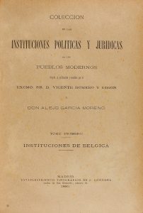 1885. ROMERO Y GIRON, VICENTE; GARCIA MORENO, ALEJO: COLECCIÓN DE LAS INSTITUCIONES POLÍTICAS Y JURÍDICAS DE LOS PUEBLOS MODERNOS. [11 VOLÚMENES]. .I. Instituciones de Bélgica.- II. Insituciones de Alemania.- III. Reino de Italia.- IV....
