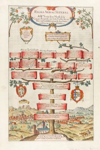 1608. (HERÁLDICA). FOLIO CON ÁRBOL GENEALÓGICO DE LOS REYES DE ARAGÓN: REGES ARRAG. VETERES. Precioso árbol genealógico grabado de los reyes de Aragón. Hay un paisaje de Burgos y su castillo coronando una loma. Cartelas coloreadas en un color...