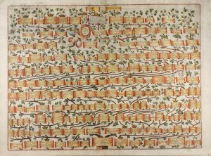 1608. (HERÁLDICA). ÁRBOL GENEALÓGICO DE LA CASA REAL DE FRANCIA. Gran folio apaisado. Multitud de detalles y excelente conservación de los colores originales. Extraído de alguna obra de heráldica.
