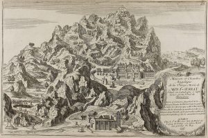 1705. (MONTSERRAT). MAISON ET CHAMBRE ANGELIQUE DE LA VIERGE MARIE DE MONT-SERRAT... A Paris: chez St. de Fer, 1705. Grabado al cobre en papel verjurado. 23 x 33,5 cm plancha; 26 x 40,5 cm papel.