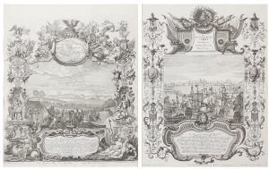 1720. (BARCELONA). DEKER; CORVINO. ´LA CITTA DI BARCELLONA IN CATTALONIA´; ´LO SBARCO IN CATALONIA DEL RE CARLO ED INTRADA SUA IN BARCELONA´. 2 vistas de la ciudad de Barcelona, grabadas al cobre, 49,5x38 cm. Dibujos de Decker grabados por...