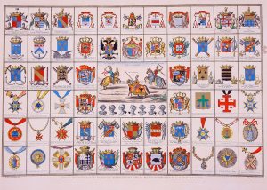 1940 ca. (HERALDICA). TABLEAU DES ARMOIRES ET DES DECORATIONS HONORIFIQUES DES FAMILLES ROYALES ET NOBILIAIRES DE LA PLUPART DES NATIONS. Ediz. Fonte Vecchio. Litografía con iluminaciones metalizadas en plata y dorados, a partir del original de...