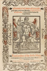 este rey don Alonso el Sabio. Impresso en Valladolid: a costa y en casa de Sebastian Martinez, 1554. Acabaronse a diez y ocho de Henero. 1 h. +LIII folios. Texto a dos columnas, fileteado. Capitales. Portada iluminada con grabado que representa el rey Alfonso X y orla. La tercera hoja también orlada. En h. LIX se halla la anteportada propia de la segunda crónica en la que consta: ´Aqui comi¯eça la chronica del muy noble rey don Sancho el brauo ...´ Defol. LIX a LXXCIIl, 1 h. CCPB 197-X: No debe confundirse con la ´Crónica general´ también llamada ´Estoria de España´ de Alfonso X. Alfonso XI ordenó la redacción de la crónica de los tres últimos reyes (Alfonso X, Sancho IV y Fernando IV) seguramente a Fernán Sánchez de Valladolid. El ejemplar que ofrecemos contiene dos de las tres crónicas. Encuadernado en plena piel con ruedas en seco en los planos y escudo en dorado del Marqués del Saltillo. Ruedas en las cejas. Lomo con nervios y hierros en seco. Cortes dorados. Ejemplar corto, en algunas páginas, del margen superior y derecho.