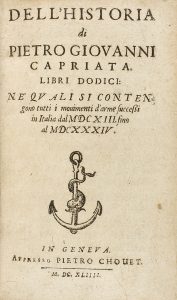 1644. (HISTORIA). CAPRIATA, PIETRO GIOVANNI: DELL´HISTORIA. Geneva: Appresso Pietro Chouet, 1644. 8º menor. 16 h. + 1205 p., 24 h. Viñetas. Enc. de época en plena piel, nervios, cortes pintados.