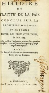 1665. (BRUGALLA-HISTORIA). HISTOIRE DU TRAITTE DE LA PAIX CONCLÜE SUR LA FRONTIERE D´ESPAGNE ET DE FRANCE ENTRE LES DEUX COURONNES EN L´AN 1659. Cologne: chez Pierre de la Place, 1665. 12º. 4 h. + 228 p. [Sigue:] RECUEIL DE DIVERSES MATIERES...