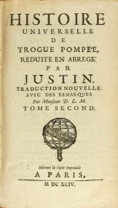1694. (HISTORIA ANTIGUA). JUSTIN: HISTOIRE UNIVERSELLE DE TROGUE POMPE´E, REDUITE EN ABREGE PAR... Paris: Suivant la copie imprimee, 1694. Dos vol. en 8º menor. I: Grabado en la portada, 8 h., 407 p., 13 h. II: 1 h., 424 p., 11 h. Viñetas. Dos...