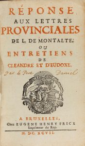 1697. (HISTORIA). MONTALTE, LOUIS DE: REPONSE AUX LETTRES PROVINCIALES DE... Bruselles: Imp. Eugene Henry Fricx, 1697. 8º menor. 2 h. + 404 p. Portada a dos tintas. Enc. en plena piel, nervios, tejuelo, florones, cortes pintados. Anotaciones...