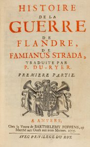 1705. (HISTORIA-FLANDES). STRADA, FAMIANUS: HISTOIRE DE LA GUERRE DE FLANDRE. Anveres: Barthelemy Foppens, 1705. Tres vol. en 8º menor. I: Frontis grabado por Harrewyn, 6 h., 552 + 166 p. Ilustr. con 9 lám. grabadas, siete de ellas plegadas.II: 3...