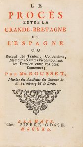 1740. (BRUGALLA). ROUSSET: LE PROCES ENTRE LA GRANDE-BRETAGNE ET L´ESPAGNE OU RECUEIL DES TRAITEZ, CONVENTIONS, MEMOIRES & AUTRES PIECES TOUCHANT LES DEMELEZ ENTRE CES DEUX COURONNES. La Haye: chez Pierre Gosse, 1740. 8º menor. 4 h. + 403 p....