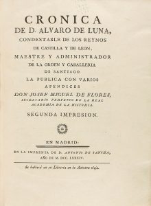 1784. (HISTORIA ESPAÑA). FLORES, JOSE MIGUEL, DE: CRONICA DE ALVARO DE LUNA, CONDESTABLE DE LOS REYNOS DE CASTILLA Y LEON. Madrid: Imprenta de D. Antonio de Sancha, 1784. 4º menor. XL + 481 p. [Sigue:] FERNANDEZ VELASCO, PEDRO: SEGURO DE...