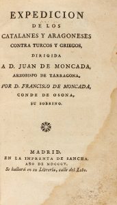 1805. (HISTORIA). MONCADA, FRANCISCO DE: EXPEDICIÓN DE LOS CATALANES Y ARAGONESES CONTRA TURCOS Y GRIEGOS, DIRIGIDA A D. JUAN DE MONCADA, ARZOBISPO DE TARRAGONA. Madrid: Imp. De Sancha, 1805. 8º. XVI + 384 p. Enc. media pasta española. Cerco de...
