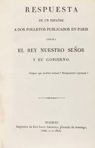 1825. (BRUGALLA). RESPUESTA DE UN ESPAÑOL A DOS FOLLETOS PUBLICADOS EN PARIS CONTRA EL REY NUESTRO SEÑOR Y SU GOBIERNO. Madrid: Imprenta de Don Leon Amarita, 1825. 8º. 81 p. Encuadernado por Brugalla en 1949 en medio pergamino y puntas.