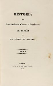 1835. (HISTORIA). TORENO, CONDE DE: HISTORIA DEL LEVANTAMIENTO, GUERRA Y REVOLUCION DE ESPAÑA. Madrid: Imp. Tomás Jordan, 1835. 4 vol en 4º menor. Se presentan los vol. 1, 2, 4 y 5 (falta el 3). I: 4 h., 411 + 125 p. II: 394 (por error de...