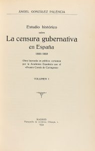 1934. (HISTORIA ESPAÑA). GONZALEZ PALENCIA, ANGEL: ESTUDIO HISTORICO DE LA CENSURA GUBERNATIVA EN ESPAÑA (1800-1833). Madrid: Tip. de Archivos, 1934. 3 vols. en 4º. I: CLXXXVIII + 284 p., 1 h.; II: 360 p., 1 h.; III: 316 p. Enc. en media piel y...