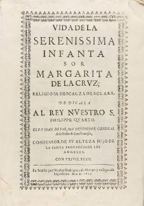 1636. (BIOGRAFIA). PALMA, JUAN DE: VIDA DE LA SERENISSIMA INFANTA SOR MARGARITA DE LA CRUZ, RELIGIOSA DESCALZA DE S. CLARA. Sevilla: Nicolás Rodríguez de Abrego, 1653. Segunda edición de esta obra de gran rareza, que ha sido atribuída por muchos...
