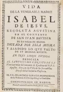 1675. (BRUGALLA). FRANCISCO IGNACIO: VIDA DE LA VENERABLE MADRE ISABEL DE IESUS, RECOLETA AGUSTINA EN EL CONVENTO DE SAN IUAN BAUTISTA DE LA VILLA DE ARENAS. Madrid: por la Viuda Francisco Nieto, 1675. 8º. 16 p. + 470 p., 10 p. Dictada por ella...