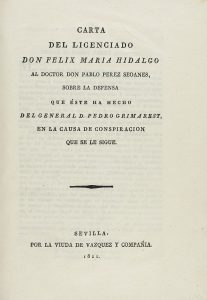 Brugalla en 1949 en medio pergamino y puntas. [Más:] CARTA DEL LICENCIADO DON FELIX MARIA DE HIDALGO AL DOCTOR DON PABLO PEREZ SEOANES, SOBRE LA DEFENSA QUE ESTE HA HECHO DEL GENERAL D. PEDRO GRIMAREST, EN LA CAUSA DE CONSPIRACION QUE SE LE SIGUE. Sevilla: por la viuda de Vazquez y Compañía, 1821. 8º mayor. 26 p. Homóloga encuadernación. Ex-libris Marqués del Saltillo.