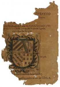 Quevedo pero desfortunadamente no está completo: La portada se conserva en parte, ha perdido el título y el nombre del autor pero conserva prácticamente completo el grabado xilográfico, 3 h.+ sin A1 y de 3 (A2) a 99 p. y pasa a p. 199 hasta p. 208, donde vuelve a hacer un salto a la p. 281 hasta p. 288. Este último salto es un error de paginación que CCPB documenta, además la llamada de p. 208 coincide con el principio de la p. 281. Sigue de p. 289 a 312 donde hay otro error de paginación pero de nuevo la llamada confirma que el texto sigue correctamente pero numerado de p. 241 a 252. El papel está tostado y la última página tiene pérdidas en las puntas y otras hojas también presentan pérdidas. Enc. en media piel con la lomera despegada. Los textos que este ejemplar contiene son: ´Vida de Marco Bruto´, ´Carta a Luis XIII´ (este no está completo) y ´ el Rómulo´. Palau dice que son dos vol. y que ´El Romulo´ es el primer texto del segundo de ellos, sin embargo en el colofón dice el poeta ´Mientras yo a honra, y gloria de vuestro gran nombre, en el qual deseo acabar esta corta vida, acabo el libro´ seguido de un ´cul-de-lampe´. Al parecer La obra que Palau detalla no coincide exactamente con esta, que se asemeja más a la que se describe en CCPB482171-8, incluídos los errores de paginación. En cualquier caso se trata de una obra extremadamente rara y muy codiciada ya a principios del s.XX.