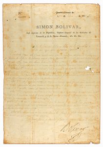1818. (VENEZUELA-NUEVA GRANADA). MANUSCRITO CON LA FIRMA DE SIMON BOLIVAR. Folio manuscrito con fecha 17 de febrero de 1818 donde Simón Bolívar firma como jefe Supremo de la república, Capitan-General de los Exércitos de Venezuela y de la...