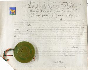 1819. (FIRMA REAL). DOCUMENTO FIRMADO POR LOUIS XVIII, REY DE FRANCIA Y DE NAVARRA. Documento sobre pergamino de 40 x 51 cm. Lleva una miniatura del escudo de la casa Bober, a la que hace referencia el escrito. Lleva la firma del rey Luix XVIII y...