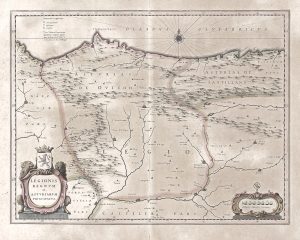 1640 Ca. BLAEU: LEGIONIS REGNUM ET ASTURIARUM PRINCIPATUS. Mapa grabado al cobre 39 x 52 cm, sobre hoja de 46 x 56 cm, límites coloreados. Texto en el dorso en francés. Procede del ´Theatrum Orbis Terrarum´. Papel tostado.