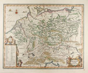 1657. (GRABADO). JANSSON, JAN: GERMANIAE VETERIS. NOVA DESCRIPTIO. Gran folio. Mapa de Alemania central realizado por uno de los cartógrafos más importantes de su época. Con las ciudades, ríos y bosques marcados a color. Mapa que perteneció a...