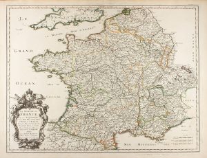 1665. (FRANCIA). SANSON: LE ROYAUME DE FRANCE ET SES ACQUISITIONS VERS LES PAYS BAS, AL´ALLEMAGNE, L´ITALIE, ET L´ESPAGNE. Paris: Ed. Pierre Mariette, 1665. 44 x 58 cm. Magnífico mapa con los límites en color y cartela arquitectónica. Muy bien...