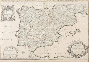 MAJORQUE ET LES PRINCIPAUTÉS D´ASTURIES, BISCAYE ET CATALOGNE. París: H. Iaillot, 1689. Mapa grabado al cobre, 63 x 92 cm. Doblez central algo marcado. Mapa de España con los diferentes reinos, incluye las islas baleares, fronteras coloreadas a mano. Tres leyendas, una con la dedicatoria al Delfín de Francia, otra con el título del mapa y los datos de la impresión y otra con las escalas.