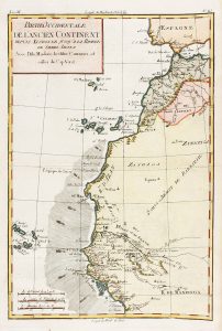 1780 ca. (CANARIAS). PARTIE OCCIDENTALE DE L´ANCIEN CONTINENT DEPUIS LISBONNE JUSQU´A LA RIVIERE DE SIERRA LEONA AVEC L´ISLE DE MADERE, LES ISLES CANARIES ET CELLE DU CAP VERD. Mapa grabado al cobre y coloreado, 39 x 25 cm. Procedente del Atlas...
