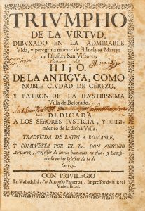 1695 ca. (BRUGALLA). ALVAREZ, ANTONIO: TRIUMPHO DE LA VIRTUD DIBUXADO EN LA ADMIRABLE VIDA, Y PEREGRINA MUERTE DE EL INCLYTO MARTYR DE ESPAÑA, SAN VICTORES HIJO DE LA ANTIGUA, COMO NOBLE CIUDAD DE CEREZO Y PATRON DE LA ILUSTRISSIMA VILLA DE...