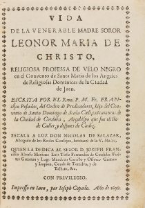 1699. (BRUGALLA-JAEN). POSADAS, FRANCISCO: VIDA DE LA VENERABLE MADRE SOR LEONOR MARIA DE CHRISTO. Jaen: por Ioseph Copado, 1699. 8º menor. 14 p. + 228 hojas, 1 lámina con grabado calcográfico retrato de Sor Leonor. Enc. por Brugalla en 1950 en...