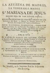 1764. (BRUGALLA-MERCEDARIO). SALVADOR, Fr. PEDRO DEL: LA AZUZENA DE MADRID, LA VENERABLE MADRE Sor MARIANA DE JESUS, INSIGNE DE TAN ILUSTRE PATRIA. Madrid: Imp. Real de la Gaceta, 1764. 8º mayor. 12 h (incl. port.) + 536 p., 4 h. 1 lámina de la...