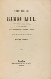 ROSSELLÓ. Palma: imprenta de Pedro José Gelabert, 1859. 4º. 771 p. Magnífico ejemplar con todos sus márgenes naturales sin cortar. Encuadernado en medio pergamino con tejuelo en el lomo. Primera edición. Primera publicación de obras originales en lengua catalana del sabio Ramon Lull. Palau 143687. Rogent 412.