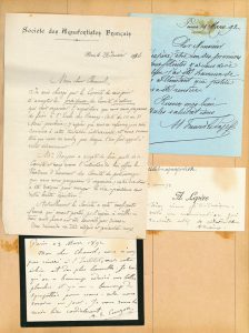 Recueil qui permet de retracer la carrière de ce graveur oublié, célèbre en son temps pour ses estampes d’après Corot et les paysagistes de la forêt de Fontainebleau. Il fut président de la Société des Aquafortistes français. Lettres de Louis-Hector Allemand, Robert Baschet, Eugène Bellangé, Jean-Jacques Bellet, Henri Beraldi, Adolphe Beugniet, Ernest Boetzel, Auguste Boulard, Félix Bracquemond, Philippe Burty, Jean-Charles Cazin, Philippe de Chennevières, Gaston Coindre, Jules Comte, Charles Courtry, Alfred de Curzon, Paul Debrou, Eugène Decisy, Loys Delteil, Maurice Deville, Jules Didier, Alphée Dubois, Georges Duplessis, Jules Dupré, Maurice Duseigneur, Victor Focillon, Alphonse François, Léon Gaucherel, Léon Gauchez, Gustave Geffroy, Albert de Gesne, Charles Giroux, Fernand Guey, Eugène Guillaume, Gustave Guillaumet, Antoine Guillemet, Henry Hamel, Edmond Hédouin, Jules Jacquemart, Achille Jacquet, Georges Jamet, Alfred Lachnitt, Auguste Laguillermie, Maxime Lalanne, Stanislas Lami, Charles Lapostolet, Jules Laurens, Alfred Lebrun, Lionel Le Couteux, Henri Lefort, Auguste Lepère, Léon Lhermitte, Édouard Lièvre, Alfred Louviot, Maurice Magnien, Paul Martin, Émile Michel, Charles Michelin, Augustin Mongin, Moreau de Charny, Émile Papillon, Paul Rajon, Mary Renard, Alfred Robaut, Louis Ruet, Edmond Simon, Achille Sirouy, Jules Veyrassat, Charles Waltner, etc. Cartes de visite autographes : Alfred Bahuet, Jules Ballavoine, Camille Bernier, Charles et Joseph Blanc, F. Bracquemond, Eug. Ciceri, Adrien Didier, Ch. Dunod, J. Dupré, H. Fantin-Latour, L. Flameng, V. Focillon, G. Guillaumet, H. Harpignies, Aug. Hotin, Max. Lalanne, Ad. Lalauze, Ch. Maniglier, Alfred Nachet, Th. Revillon, A. Robaut, H. Roujon, Ch. Tardieu, Jules Valadon, etc. Cartons d’invitation de Napoléon Bonaparte-Wyse et Mme Rattazzi, et du maréchal président Mac Mahon et la maréchale. Faire-part du décès de Chauvel, coupures de presse, circulaires, minutes de lettres, etc.
