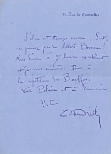 [Paris 28 janvier 1901]. « Si vous n’êtes pas à Bruxelles, vous êtes un méchant garçon. Venez boire à cinq heures, mercredi prochain. Clairin, que j’ai vu, ne veut pas faire de diminutions sur le loyer de l’atelier rue de Rome. Au moins 4000, c’est idiot »... [26 mars]. Elle lui donne rendez-vous pour « arranger quelque Maple pour demain mercredi de 2 à 5 car je dois être – et vous aussi – à 5 h ½ chez Licette demain. – Ma nouvelle amie m’a parlé de vous, – mais pas tout le temps. C’est une bête charmante et flattée des caresses »... [10 juillet]. Elle viendra le voir en sortant du Conservatoire. « J’arrive de la campagne il y a 2 nuits. Je suis noire. Nigra sed modérément formosa [...]. Willy a un ongle incarné au pied, il souffre beaucoup et on le charcute, mais il vient au Conservatoire »... [Nürnberg fin août]. Elle n’a qu’une seule pensée dans « ce Nürnberg maquillé [...], c’est quitter tout pour la pauvre et médiocre solitude des Monts-Bouccons. Voilà ce que m’inspire Bayreuth »... Sans date. … « ne prenez pas de billets Barnum ! Nous dînons à 7 heures exactement et je vous emmène tous à la répétition des Bouffes. Vive Polaire »... –Les dimanches sont « impossibles. Ceci posé, je suis à vous le reste du temps »... On joint une L.A.S. de Willy à Sert, [15 mai 1901].