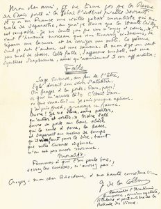 Importante et remarquable correspondance amicale et littéraire, pleine d’érudition, commentant avec beaucoup de verve ses lectures et le monde littéraire, son travail d’écriture, ses états d’âme, ses publications et celles de ses amis écrivains, comme Colette qu’il évoque et fréquente régulièrement. Nous ne pouvons en donner que deux exemples. « Le bouddhisme ici pour moi ? Un étrange état en tout cas, quelque chose de ralenti, de quelquefois assez intense, mais à arrière-goût de mort, un état qui me rappelle très précisément mes dix-huit, dix-neuf ans, où seul, avide, ennuyé, tendu vers tout, ne touchant rien, je m’écoeurais de moi-même. Le paradoxe d’être ici, dans ce paysage de vacances, entouré de barbelés, de blockhaus, d’artillerie, de troupes et menacé d’expulsion naturellement, mais très calme, extraordinairement calme, et plantant mes petits pois et mes pommes de terre, et brûlant mes feuilles mortes (mes aiguilles de pins mortes), et courant les campagnes pour un peu de viande, pour un peu de vin, et ruminant le pas et la mort, devenu étrangement présent. Certes ce comique de Claudel est inacceptable. Il est en béton armé. Et nous sommes d’accord sur tout. Dès qu’on nous emmène loin et haut, votre sens critique tombe. Nous sommes indulgents et contents. Intense volupté d’admirer. C’est le contraire de tout ce que j’aime forme et matière – mais ça m’a fait un énorme plaisir, musical. Est-ce qu’il n’y a pas là-dessus une grande influence japonaise ? Est-ce qu’il n’y a pas des images comme ça dans le vieux théâtre japonais ?... Un peu de pluie. Trop peu de talent... Et cette manie de chercher l’esprit en dehors de la chair ! C’est les réconcilier qu’il faut ! Monter très haut mais garder la chair comme moyen d’expression. Ne pas opposer Dieu et la vie. Faire servir la vie à l’expression de Dieu. Toucher Dieu pour la vie »... « Montherlant m’avait écrit qu’il écrivait une pièce à trois personnages. Je m’étais dit : “Je lui souhaite bien du plaisir ! Il verra ça !” Toujours l’antagonisme des écrivains et des auteurs dramatiques. Le théâtre n’est pas (j’exagère à peine et même je ne suis pas sûr d’exagérer du tout), un genre littéraire. Vous me répondrez : Racine. Mais on pourrait dire – et ce serait à peine un paradoxe – que Racine n’est pas littéraire. Il n’est pas plus littéraire que les Évangiles ne sont littéraires. Giraudoux dit que les mots et Racine sont tous comme le mot pain ou le mot eau »...