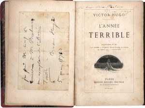 Édition illustrée, avec des gravures de Jean-Paul Laurens, Léopold Flameng, Émile Bayard, Daniel Vierge, Éd. Morin, Lix et Victor Hugo.. Envoi autographe signé sur la page de titre : « Au brave citoyen Bonhoure Victor Hugo ». On a collé en regard, une P.A.S. : « Je prie M. Lévy de remettre à M. Bonhoure un exemplaire de l’Année Terrible. Victor Hugo 5 mars 1876 ». On a également monté à la fin du volume un feuillet impr. avec le texte du Mandat contractuel : Élections du 7 janvier 1872. Victor Hugo. Mandat contractuel... : Bonhoure est l’un des délégués du Comité électoral des Travailleurs signataire de ce mandat soutenant le candidat Hugo. [Hugo avait refusé le mandat impératif et demandé à ses soutiens, dont Bonhoure, ce mandat contractuel : « M. Victor Hugo ne pouvait accepter le mandat impératif, la conscience ne reçoit pas d’ordres ; mais il pouvait et il sentit qu’il devait prendre l’initiative de la transformation du mandat impératif en mandat contractuel, c’est-à-dire réaliser plus sûrement le progrès électoral par le contrat librement débattu et consenti entre le mandant et le mandataire ». Apprenant sa défaite, Hugo écrivit : « Le 7 janvier 1872, Paris avait à choisir un représentant ou un député ; il a choisi un député. »]