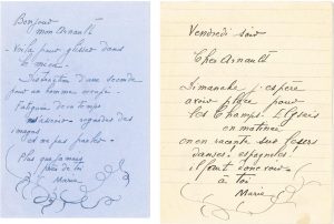 Ensemble de billets amicaux à un collectionneur et admirateur (et amant, à l’époque du cubisme), le Dr Tzanck, pionnier de la transfusion sanguine.. « Ci le dessin [...]. Il est impossible que j’ai aussi bêtement marqué le grand Fidèle par le milieu. Voici donc un peu de ton image. C’est Dimanche – sans grand entrain – que Love pour Toi »... « Voilà pour glisser dans le mica. Distraction d’une seconde pour un homme occupée »... « Je suis contente que tu aies téléphoné tout à l’heure – plus tranquille. Hier dans la voiture tu étais fatigué – et j’avais une impression de sombreur qui m’a inquiétée jusqu’à ce soir. Tant de clarté entre nous deux »... « Voici trois petites photos deux avec Dina adorée et l’autre faite l’année dernière avec ton tableau »... « Ah ! Vendredi prochain 3 heures à l’atelier rendez-vous avec la mère de l’enfant américain. Le père trouve son fils un peu trop sérieux. Il paraît que c’est un enfant très rieur. Un enfant auquel on dit de rester tranquille cinq minutes prend immédiatement une de ces têtes surtout les garçons »... « Louise Hervieu long téléphone [...] Elle va t’envoyer son petit opuscule. Tu sais qu’elle m’appelle sa mémère »... « Toujours Fidèle pas très joli ni digne d’un cache – mais le cœur y est »... « Bonjour Arnault – on est occupé heureusement. Dimanche prochain je vais voir Valentine Tessier dans nouvelle pièce Vieux Colombier en matinée. À Toi »... « Je pense à Toi. Le froid commence. Il faut que je m’organise autrement avec l’atelier »... « Un livre pour Toi les saints de l’Inde et moderne. Je suis en train de le lire rien d’une sainte Marie »... « J’ai acheté Le Rocher de Brighton pour Toi – Je l’ai parcouru il y a un moment – presque tous les livres de ce Graham [Greene] me fatigue très cérébral et à la mode »... « Levée tard écrit six lettres et pas une à Toi – alors non – surtout que c’est à Toi que j’aime écrire »...