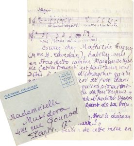 Charmante correspondance à l’actrice qui fut aussi sa maîtresse. Vendredi [1915 ?]. « Horreur d’enfant ! Je viens de lire votre article. Est-il permis de faire des choses pareilles ! Et vous en êtes fière ? [...] je serais bien heureux si vous trouviez quelqu’un d’assez gentil pour vous battre quand vous vous faites photographier en Émile Zola de la Bête Humaine. Yvonne, Suzy et Pierre Labrouche sont trop doux »... Dimanche. « Je me suis brusquement entiché de la personne la plus bruyante qu’il y ait à Paris. Il n’y en a pas deux. Vous savez donc qui, bien que vous ne la connaissiez pas. Dès le premier soir, elle et sa sœur ont passé quatorze heures dans mon lit, ce qui a fait un scandale épouvantable à Boulainvilliers. Le lendemain, l’amant qu’elle avait depuis quatre ans (et dont vous savez le nom illustre) a rompu avec elle. Puis, comme rien n’est médiocre, ni effacé, ni silencieux avec Mlle X, il ne s’est plus guère passé un seul jour sans que j’aie moi-même un incident éclatant ou dramatique depuis le 28 juillet »... Avec une Prière à la manière de celles que Musidora écrit sur son petit carnet, sous forme de dialogue entre Louÿs et Dieu : « faites que Musidora ne m’aime pas, parce que je suis l’ami de Pierre Labrouche et que je ne veux pas éprouver un pareil conflit de sentiments »... – Il la taquine sur un admirateur grec qui a fait une « cour insensée » à la « petite Sainte Nitouche » consentante, sous les yeux scandalisés de Louÿs. « Moi qui ai toujours été si convenable avec vous, si pudique et si réservé, il faut que je voie mes amis entreprendre à ma barbe ce que je m’interdis par sincère amitié pour qui vous savez [...]. Ah ! il s’est passé bien des choses depuis que je ne vous ai vue, Musy. Tant de choses que je suis à bout d’émotions. Et hier après avoir accepté à 9h ¼ d’accompagner ma meilleure amie (ma meilleure amie de la semaine) chez une illustre dame, j’ai fini par rentrer chez moi parce que j’avais eu trop d’incidents, d’imbroglios, de drames et de flagrants délits depuis le commencement du mois. Alors soyez gentil demain : ayez un petit midnight-tea tout à fait childish et innocent »... 25 janvier 1919. Sous quelques mesures d’un air des Brigands d’Offenbach, il l’invite à courir chez Mathilde Auguez (Mme H. Lavedan) et de s’habiller en Fragoletto comme Marguerite Ugalde. « Dites à Auguez d’imaginer qu’elle pousse encore ce cri de joie dans la gaieté inouïe qu’inspiraient le visage, la voix, le jeu de José Dupuis [...]. Et puis, s’il m’arrive encore (et cela m’arrivera) de vous comparer à l’Être Parfait, dans mes lettres et mes discours, ne me regardez plus tout tristement, comme vous l’avez fait ce soir et avant-hier, avec vos yeux de 300 bougies »... Reproduit page 49