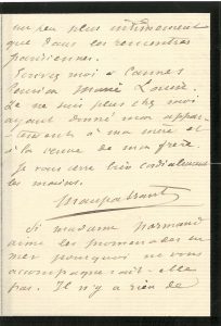 Sur l’adaptation dramatique de sa nouvelle Musotte. « Je me mets en route pour Cannes demain soir dimanche. Il m’est impossible de m’arrêter à Marseille parce que j’ai des rendez-vous à Cannes le jour même de mon arrivée. Mais vous seriez bien gentil de venir m’y voir. Nous causerons de notre pièce. Nous nous promènerons en mer et nous ferons connaissance un peu plus intimement que dans les rencontres parisiennes. Écrivez-moi à Cannes Pension Marie Louise. Je ne suis plus chez moi ayant donné mon appartement à ma mère et à la veuve de mon frère »... Reproduit page 55