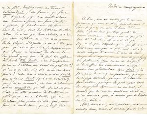 Très belle et longue lettre à sa « marraine », sur la fin de sa passion pour la princesse Belgiojoso, et évoquant la fin de sa liaison avec Rachel. Musset est parti se consoler et se reposer à la campagne chez un cousin. « Eh bien, vous ne vouliez pas le croire. Qu’est-ce que vous en direz maintenant ? Suis-je parti ou non ? hein ??? – hélas ! je ne suis que trop parti. En bonne conscience, savez-vous ce que j’ai fait là ? la chose du monde la plus sage et la plus stupide qu’on puisse voir. Raisonnez un peu et dites moi : il n’y avait moyen d’arriver à rien de bon, danger de s’aigrir, comme vous le prévoyiez très justement, item raison de souffrir et de souffrir très sérieusement malgré toutes mes plaisanteries &c donc j’ai fait pour le mieux en partant, parce que le voyage distrait, parce que l’absence fait oublier, parce que le parti-pris rend le sang-froid &c – en un mot il aurait pu m’arriver malheur et il ne m’en arrivera pas, à moins que le diable ne s’en mêle.. Mais, marraine, mais, madame, mais écoutez donc, mais, il aurait pu m’arriver bonheur – entendons-nous, car je ne suis plus fat. Il y aurait très certainement pu y avoir entre cette personne et moi un lien, une affection, qui, avec un peu d’habitude & de vieillesse, aurait pu devenir une chose très gentille, sans même coucher tout à fait ensemble, mais seulement sous le même toit. Or maintenant je parle très sérieusement, me connaissant fort bien comme je suis, tout est absolument rompu net. Ce sera la seconde édition de mon histoire avec Rachel que j’ai plantée là par mauvaise humeur, sans aucune raison valable, laquelle Rachel s’est piquée, a voulu dire qu’elle m’avait planté là la première, lequel moi me suis fâché tout rouge, lettres échangées, tapage, criaillerie & finalement ––––– eau de boudin. Voilà approchant ce qui m’advient derechef au sujet de cette belle personne méridionale. Je casse un pot renversé, disiez-vous très bien l’autre jour. C’est exactly true. Personne n’est plus faible, plus tergiversant, et plus poule mouillée que votre indécrotable filleul, mais une fois le pont passé bonsoir la rivière. Ce n’est pas du courage que j’ai c’est une espèce de besoin d’aller, comme un cheval qu’on entraîne qui fait que je ne reviens plus sur une barrière franchie. C. [Cristina] est maintenant comme morte pour moi – comparaison : – figurez-vous un œuf qu’on fait danser dans sa main ; il est bien frêle et bien léger mais toujours très bon à faire cuire et très prêt à se laisser mettre au pot tant qu’il n’est pas cassé. Mais une fois tombé par terre et cassé, il n’y a pas de cuillère il n’y a pas rien qui puisse remettre le jaune dedans et le faire redevenir œuf. Il ne reste qu’une coquille en morceaux et un petit gribouillis. Tel est l’état de mon aimable cœur..Eh bien, marraine, je prends la liberté de dire, et j’en ai le droit ou le diable m’emporte, dussiez-vous me trouver outrecuidant, ces femmes qui font les bégueules, qui me maltraitent, me méconnaissent, me font souffrir à plaisir, & finalement se font haïr de moi, sont des sottes en toutes lettres. Ce n’est pas leur intérêt, ce n’est pas leur instinct, ce n’est rien que de la blague à laquelle je ne me trompe pas. Qu’est-ce que c’est, je suppose, que Marco m’écrivant du haut de ses grands yeux que : “le seul bon effet des succès trop faciles c’est d’empêcher qu’on ne s’obstine aux succès impossibles” ? Qu’est-ce qu’elle veut dire avec ses succès faciles ? Certes rien n’était moins facile que certains succès (quel mot horrible !) que j’ai en mémoire, et rien n’était moins impossible qu’elle. Qu’est-ce que c’est que cette manière de traiter en petit garçon ou en libertin usé un homme plus jeune qu’elle qui, au fond, la vaut bien, qui se laisse faire par faiblesse, ou plutôt, comme disaient nos pères, par mignardise, mais qui peut se redresser si on lui marche sur la queue ? Sottise, marraine, vanité qui se trompe & qui manque son but en voulant aller au-delà. Qu’aurait-elle dû faire ? direz-vous peut-être. Céder ? faut-il donc céder sous peine d’encourir l’auguste colère de monsieur ? – Non, marraine, mais seulement comprendre, ne pas feindre de croire ni vouloir faire croire qu’après 10 ou 15 ans d’une vie connue, on est la présidente de Tourvel – ne pas profiter de ce qu’on voudrait se rendre inreconnaissable pour méconnaître les autres – savoir à qui on parle – en un mot avoir la moitié seulement du bon sens, de la délicatesse et de la franchise d’une très petite personne qui demeure par là au tournant de Tortoni, et qui sait la différence qu’il y a entre un bœuf et un bouvier. Voilà mon dire. Maintenant j’ai les côtes rompues et très mal aux genoux parce que je m’en viens de courir après un chevreuil qui s’en moquait bien et qui avait raison – mais je me moque bien de lui à présent que j’ai ôté ma veste et que j’ai changé de bottes. Ceci n’est point une métaphore, je rentre de la chasse et j’ai une quantité très suffisante de lieues dans le dos. Et je vous assure que le célèbre poëte Horace, lorsqu’il a dit que le chagrin montait en croupe derrière le cavalier, a dit une bêtise pommée. Le chagrin tombe de cheval à chaque tems de galop. Je vous écris avec le cœur libre, la conscience tranquille, et les mains (mille pardons) sentant l’écurie. Adieu marraine. Il y a bien peu de monde que j’aime autant que cette petite fée toujours bonne qui se tient debout sur vos petits pieds »...