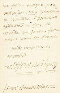 Il lui a écrit à la Librairie Nouvelle, mais n’a pas eu de réponse : « en attendant votre retour à Paris et à vos affaires, je vous prie de me faire envoyer par quelqu’un, cinq exemplaires de Servitude et grandeur militaires et cinq du Théâtre que je veux faire relier pour les donner »...
