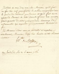 Georges-Louis Leclerc, comte de BUFFON. L.S., au Jardin du Roi 5 mars 1786, [à Louis-Bernard Guyton de Morveau] ; 4 pages petit in-4.