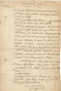 Copie conforme d’un arrêté du « Bureau d’exécution » du Comité central de Nantes [devant l’insurrection vendéenne, Nantes se déclare en danger, forme un Comité central et prend des mesures d’urgence] : « pment que la guillotine & l’échafaud fussent peints en rouge. 2ment que l’échafaud soit entouré de planches et qu’il soit mis dessous deux pieds de sable. 3ment que l’exécuteur des jugemens criminels soit chargé de cette depense, ainsi que de louer un tombereau pour conduire les cadavres au simetierre. […] ledit exécuteur se tiendra chez lui pour qu’il puisse etre prévenu lors qu’on aura besoin de lui. 4ment dans la conduite du cadavre au cimetierre il conviendrait que le tombereau fut couvert d’une toille peinte en rouge »...
