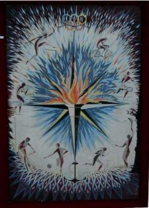 20-Verron-Coullon (J.) : Projet d’affiche pour des Jeux Olympiques. Aquarelle et gouache sur papier, signée en bas à droite et mon-tée sur un contreplaqué. Format 110x73 cm. Splendide aquarelle au style très décoratif très marqué, typique des