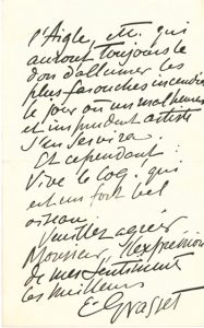 adessiné : « il y ades objets tels que les Lis, le Coq, le Bonnet Phrygien même, l'Aigle, etc. qui auront toujours le don d'allumer les plus farouches incendies le jour où un malheureux et imprudent artiste s'en servira. Et cependant : Vive le Coq ! qui est un fort bel oiseau »... 15 mai 1902, au libraire Mathias. Il conserve le Dante et l'Ovide, mais demande, comme « très ancien client » une réduction. Il n'a pas pris le Virgile à cause des médiocres vignettes : « Je possède des livres du même genre bien supérieurs et au même prix. Cependant je serais heureux de trouver un beau Virgile de cette espèce mais mieux orné. J'ai déjà celui de Lyon avec les bois de Strasbourg, mais je ne désire plus de style allemand ». Quant au Folengo, il en déteste la reliure : « Les relieurs modernes, très prétentieux, sont de parfaits ignorants dénués de toute espèce de goût. Ils sont durs, secs, froids et constipent les malheureux ouvrages qu'on leur confie »...