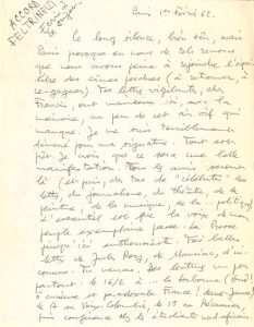d'Algérie et le massacre de Charonne (8 février). Il s'est démené pour organiser la signature de Matinale de mon peuple, qui promet d'être une belle manifestation : « Tous les amis seront là (et puis, des tas de “célébrités” des lettres, du journalisme du théâtre, de la peinture, de la musique, de la... politique). L'essentiel est que la voix de mon peuple exemplaire passe. La presse jusqu'ici enthousiaste. Très belles lettres de Jules Roy, Mauriac, d'inconnus »... Il aaussi de nombreuses lectures « et même à la Sorbonne (Ouê ! ô curieuse et paradoxale France ! dame-Janus !) », au Vieux-Colombier, pour des étudiants Nord-africains, etc. Il travaille beaucoup mais ne gagne rien : « Me revoilà, ici, le tapeur errant, dormant à droite ou à gauche, bouffant tant bien que mal, et tendu vers cette paix qui semble proche »... Il reprend sa lettre le 13 février. Après une signature formidable, le marasme est revenu, jusqu'au dégoût : « à Paris, massacres et sursauts. La fin ? Le début ? La paix ? [...] Écœuré de beaucoup de choses, et surtout de moi, sur ce volcan, avec mes grandes phrases, mes beaux espoirs »... Il va tout à l'heure aux obsèques des « victimes de l'oas et du gouvernement. [...] Pour croire encore à quelque chose. Pour ne pas sombrer dans l'incohérence, le désarroi. Je n'écris même plus ». Il n'arrive pas à finir son roman et espère bientôt pouvoir partir : « Revoir enfin Alger. Peut-être là-bas je pourrais retrouver ma force, la joie. Et pourtant ici, quelles séductions constantes : une jeunesse belle, sympathique, multiple. Tout à portée de la main, de la queue. Mais à portée du cœur, de l'âme ? Pas grand-chose »... Mais il croit encore « au pouvoir de la Révolution, au bonheur. Pour tous, avec tous »^ Il parle encore d'une gravure que veut tirer Pierre Omcikous, de son « grand bouquin de luxe avec [Abdallah] Benanteur (25 eaux-fortes, grand papier, grand format) », et des négociations avec Feltrinelli...