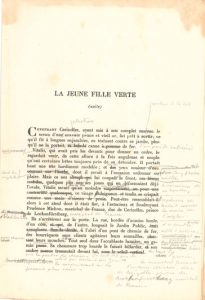 1918, chargées dans les marges de nombreuses corrections et additions de la main de l'auteur en vue d'une publication en volume chez Émile Paul en 1920. Les corrections vont du 17e paragraphe du chapitre Iv, « Cependant Cérizolles » (p.52), au 4e paragraphe du chapitre V (p. 66)... Cette épreuve porte plus de 500 mots manuscrits, la plupart au crayon et quelques-uns à l'encre violette.