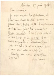 1904. Il autorise « pour une durée de trois années [^] de tirer une pièce du roman de César Cascabel. Dans l'état actuel de ma santé et de ma vue, il me serait impossible d'intervenir dans votre travail. Je m'en rapporte donc à vous pour cette adaptation »... On joint une photo par Nadar (format carte de visite, jaunie).